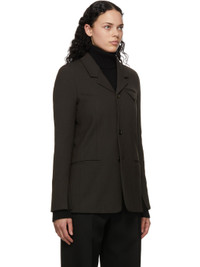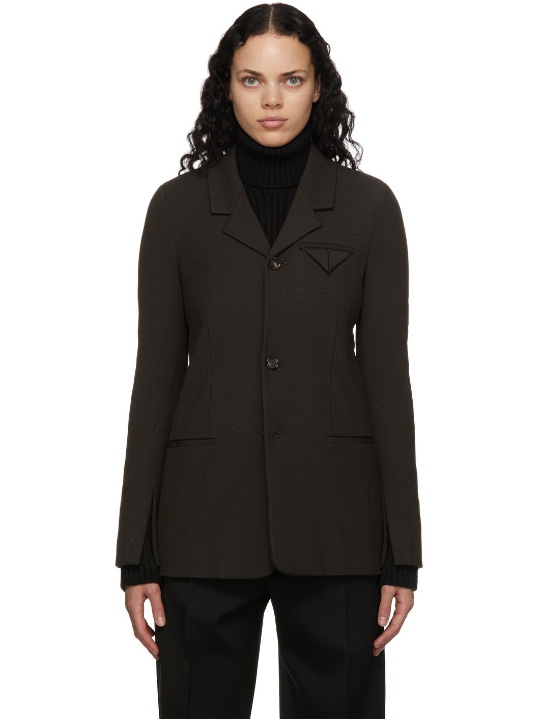 Long sleeve stretch wool-blend twill blazer in brown. Notched lapel collar. Button closure at front. Welt pocket at chest. Welt pockets at waist. Vented cuffs. Central vent at back hem. Partial satin lining. Tonal hardware. Supplier color: Fondant Body: 38% polyamide, 33% polyester, 26% wool, 3% elastane. Lining: 95% cupro, 5% elastane. Made in Italy 202798F057020