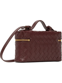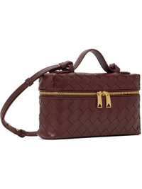 Intrecciato-woven buffed calfskin top handle bag in burgundy. · Padded carry handle · Adjustable and detachable crossbody strap · Two-way zip closure · Card slot at interior · Buffed calfskin lining · Gold-tone hardware · H5" x W9" x D2.25" Supplier color: Barolo Calfskin. Made in Italy 251798F046008