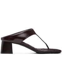 Buffed calfskin heeled sandals in burgundy. · Thong-style strap at open square toe · Logo embossed at intrecciato-woven lambskin footbed · Stacked leather block heel with rubber injection · Polished leather sole with rubber injections · Heel: H2" Supplier color: Dark barolo Upper: calfskin. Sole: leather, rubber. Made in Italy 251798F125001
