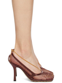 Mesh and buffed calfskin heeled sandals in burgundy. · Square toe · Detachable and adjustable chain link accent at vamp · Logo-embossed buffed leather footbed · Covered stiletto heel · Rubber outsole with rubber injections · Heel: H3.5 in Supplier color: Cherry Upper: textile, calfskin. Sole: rubber, leather. Made in Italy 231798F125006