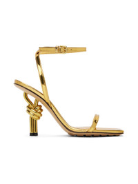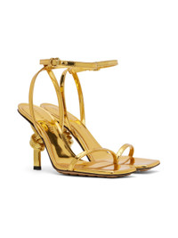 Buffed lambskin heeled sandals in metallic gold tone. · Open square toe · Adjustable pin-buckle ankle strap · Logo-embossed padded footbed · Sculptural metal stiletto heel with rubber injection · Leather sole with rubber injections · Heel: H3" Supplier color: Gold Upper: lambskin. Sole: leather, rubber. Made in Italy 241798F125003