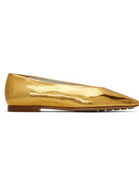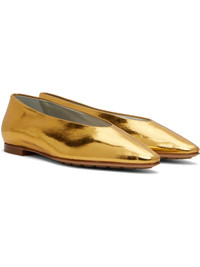 Crinkled goatskin ballerina flats in metallic gold tone. · Pointed toe · Grained lambskin and suede lining · Stacked leather heel with rubber injection · Leather sole with rubber injections Supplier color: Gold Upper: goatskin. Sole: leather, rubber. Made in Italy 251798F118002