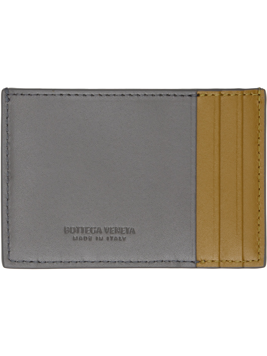 Intrecciato-woven calfskin card holder in gray. · Logo embossed at back face · Three card slots · Central note slot · H3" x W4.5" Supplier color: Lapilli/Limonite Calfskin. Made in Italy 251798M163018
