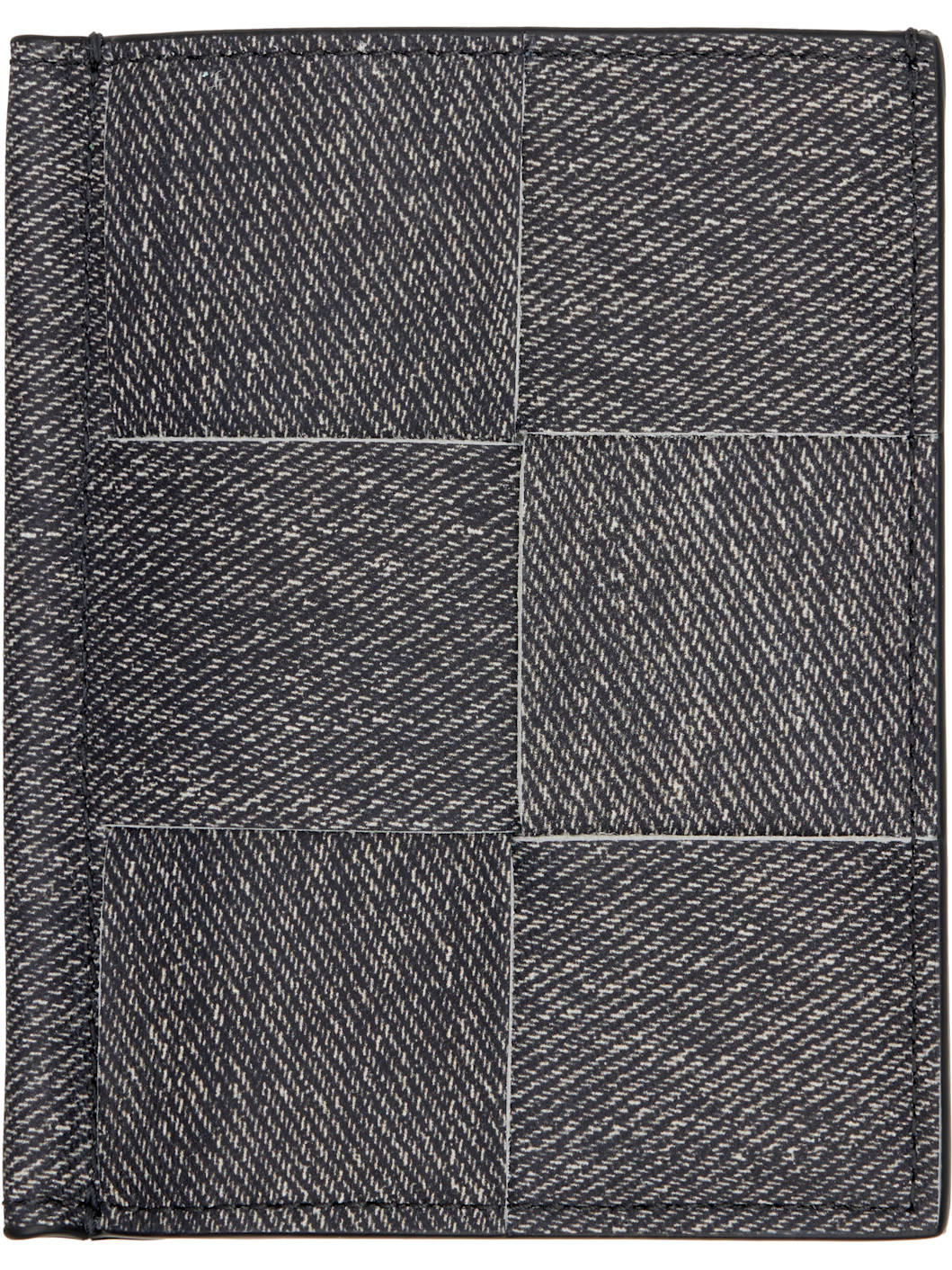 Intreccio-woven nubuck card holder. · Printed denim pattern throughout · Three card slots · Central note slot · Textile and calfskin lining · H3" x W4.5" Supplier color: Mid grey/ardoise Leather. Made in Italy 252798M163008