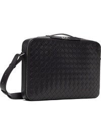 Intrecciato-woven grained calfskin briefcase in gray. · Carry handle · Detachable and adjustable crossbody strap · Luggage strap at back face · Two-way zip closure · Zip pocket and patch pockets at interior · Padded laptop compartment · Cotton canvas lining · H11" x W15.5" x D2.75" Supplier color: Shadow Body: calfskin. Lining: textile. Made in Italy 242798M167003