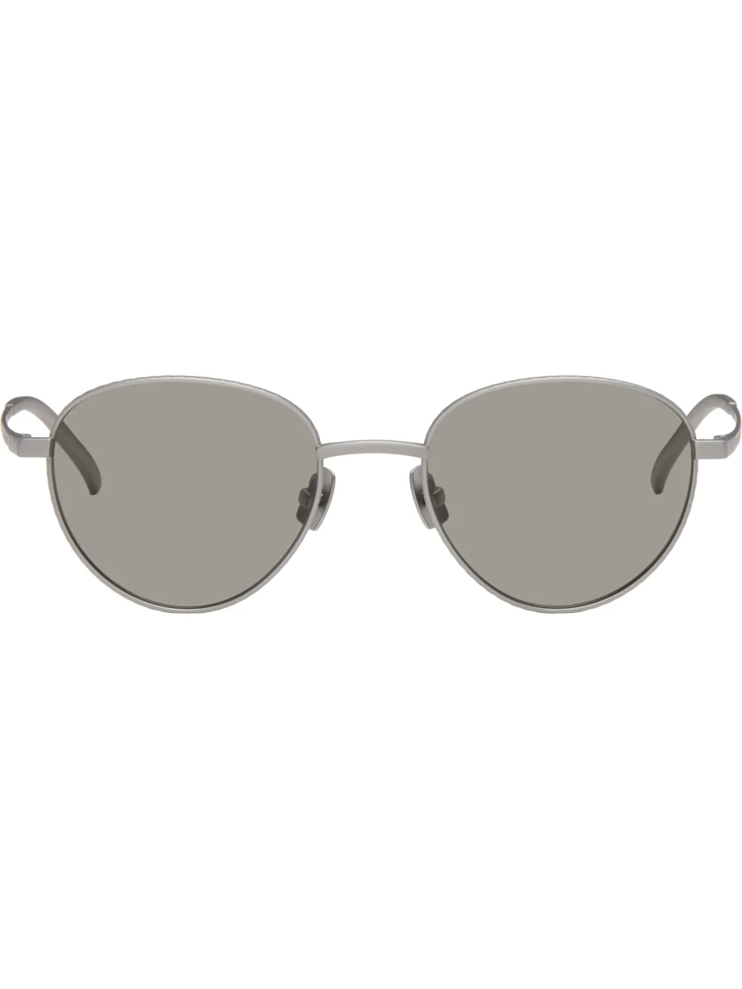 Round titanium-frame sunglasses. · Gray lenses · Adjustable nose pads · Intreccio pattern engraved at rims and temple tips · Logo engraved at temples · Includes case · Size: 50.19 145 Supplier color: Silver/Silver/Grey Titanium. Made in Japan 261798M134012