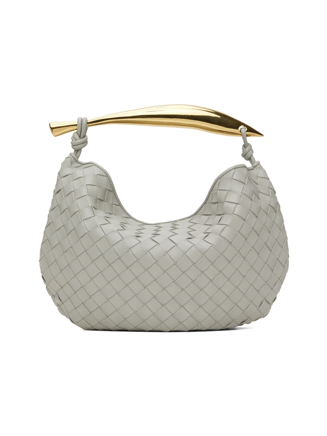 Intrecciato-woven grained lambskin top handle bag in gray. · Sculptural metal carry handle · Magnetic closure · Unlined · H9.5" x W13.5" x D2.5" Supplier color: Agate grey 100% lambskin. Made in Italy 232798F046013
