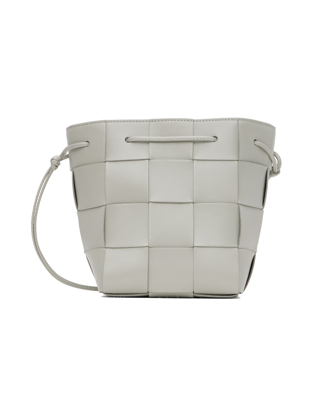 Intreccio-woven grained nappa lambskin shoulder bag in gray. · Knotted detailing at fixed shoulder straps · Drawstring closure · Bonded calfskin lining · H7 x W5.5 x D5 in Supplier color: Agate grey/Gold Lambskin. Made in Italy 232798F048053