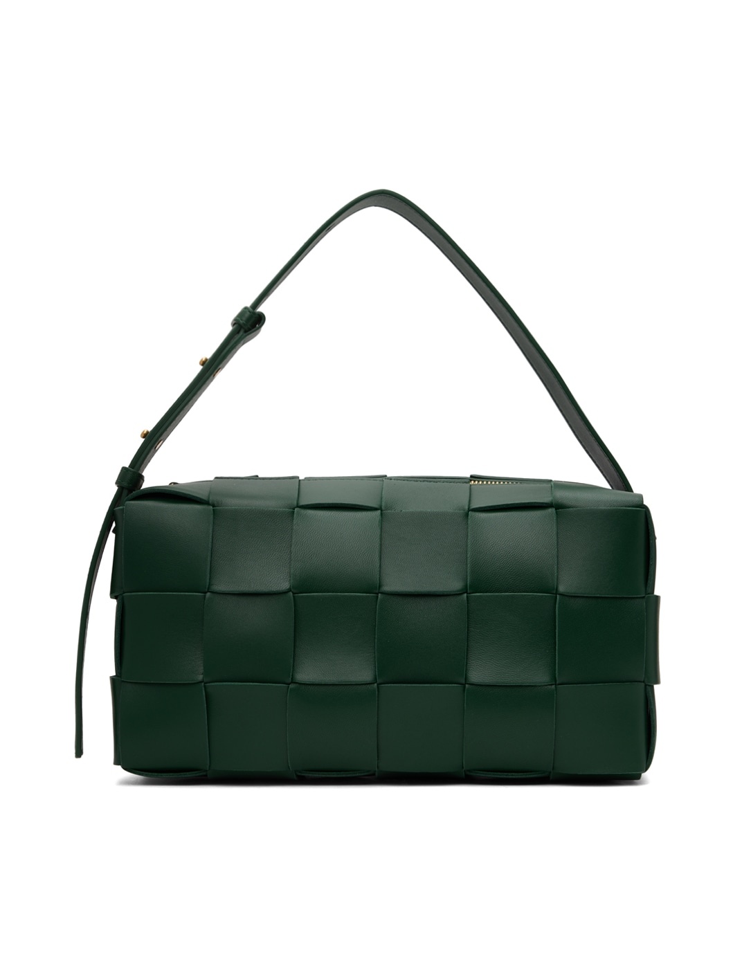 Intreccio-woven grained lambskin shoulder bag in green. · Adjustable shoulder strap · Zip closure · Zip and patch pockets at interior · Grained lambskin lining · Gold-tone hardware · H4 x W9 x D4 in Supplier color: Raintree/Gold Lambskin. Made in Italy 231798F048023