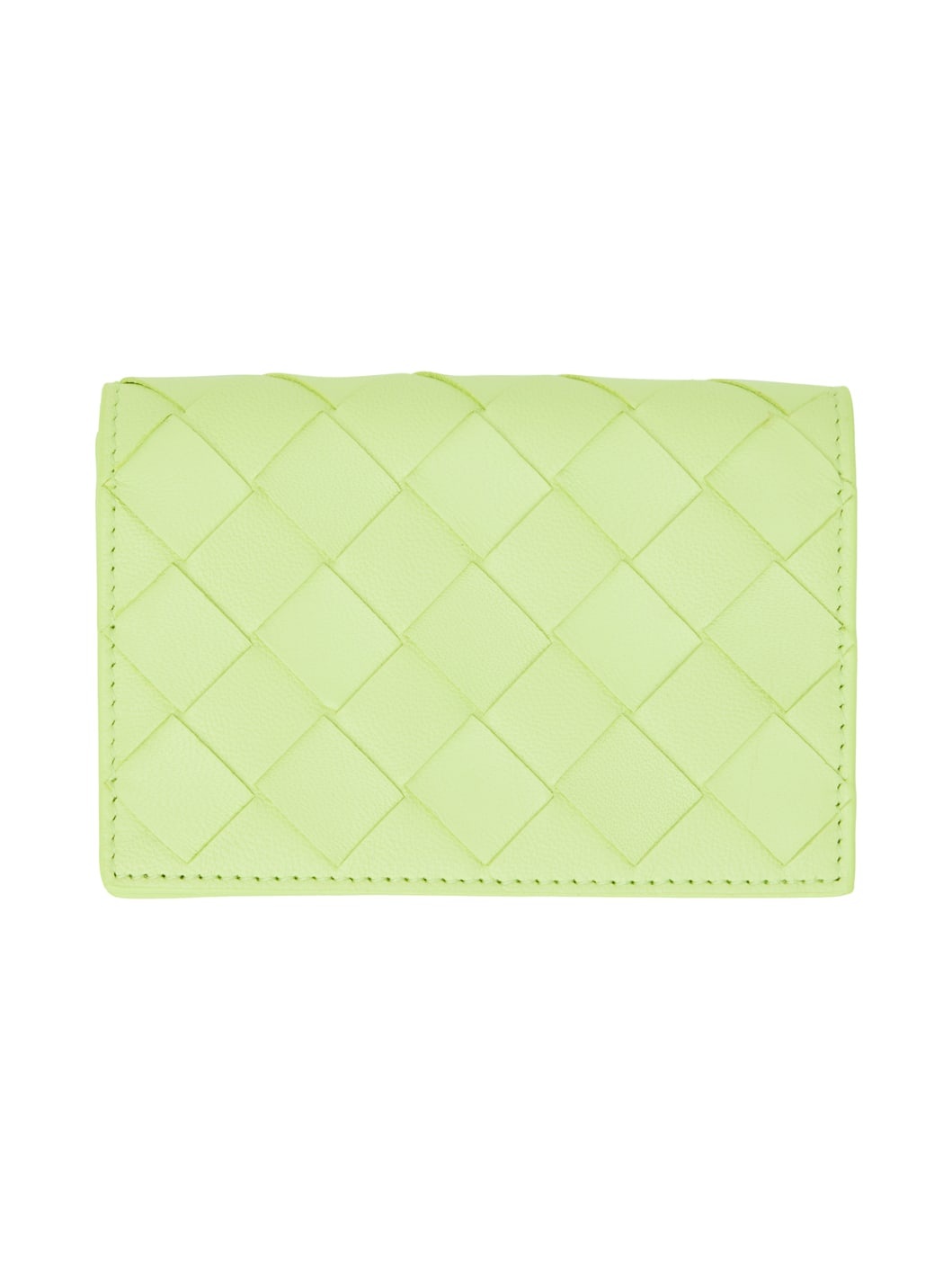 Intrecciato-woven buffed lambskin and calfskin bifold card holder in green. Burnished edges throughout. · Concealed patch pocket at face · Patch pocket at back face · Press-stud closure · Card slot at interior · Leather lining · H3 x W4.5 in Supplier color: Fennel/Gold Lambskin, calfskin. Made in Italy 232798F037010