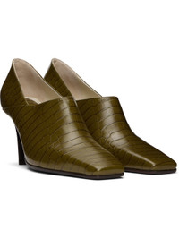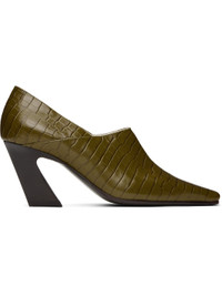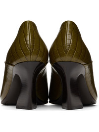 Croc-embossed calfskin heels in green. · Square toe · Logo patch at padded footbed · Buffed lambskin and suede lining · Stacked leather block heel with rubber injection · Leather sole · Heel: H3" Supplier color: Olive oil Upper: calfskin. Sole: leather, rubber. Made in Italy 242798F122009
