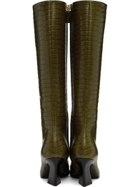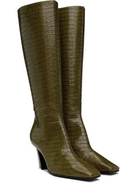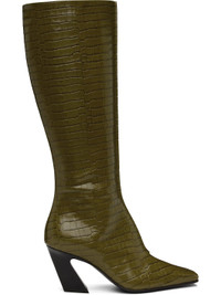 Knee-high croc-embossed polished calfskin boots in green. · Square toe · Zip closure at inner side · Buffed lambskin lining · Stacked leather block heel with rubber injection · Leather sole · Heel: H3" Supplier color: Olive oil Upper: calfskin, lambskin. Sole: leather. Made in Italy 242798F115004