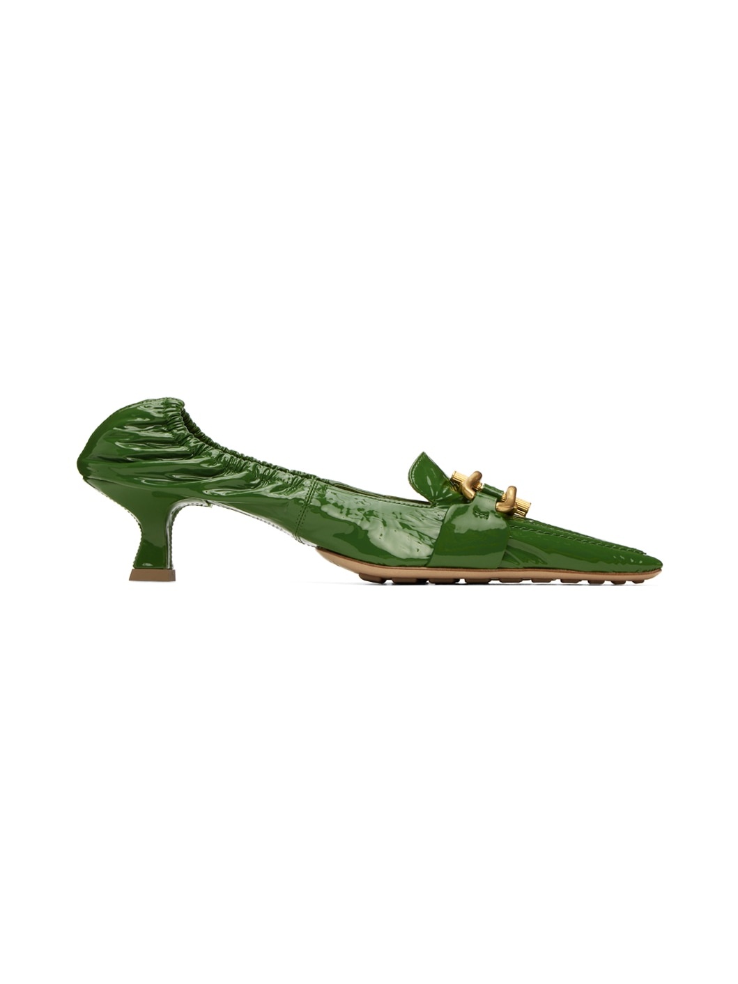 Patent calfskin leather heels in green. · Pointed square toe · Logo hardware at vamp · Elasticized collar · Logo-embossed buffed leather footbed · Covered kitten heel · Leather outsole with rubber injections · Heel: H1.75 in Supplier color: Jalapeno Upper: leather. Sole: leather, rubber. Made in Italy 231798F122003