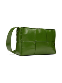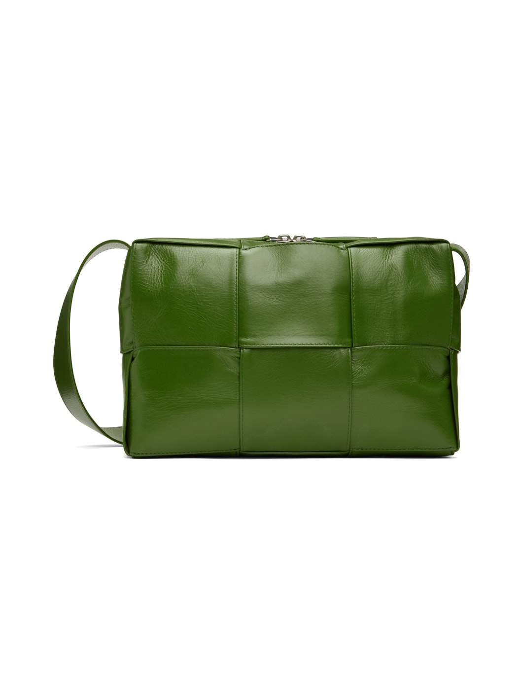 Intreccio-woven crinkled calfskin messenger bag in green. · Adjustable leather shoulder strap · Two-way zip closure · Zip pouch at suede interior · H7 x W10.25 x D3.5 in Supplier color: Avocado/Silver Calfskin. Made in Italy 231798M170037