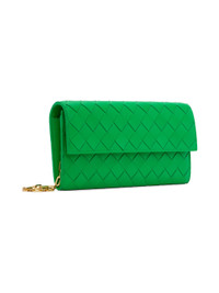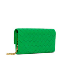 Intrecciato-woven grained calfskin shoulder bag in green. · Detachable chain link shoulder strap · Accordion panel at sides · Foldover flap with magnetic press-stud closure · Six card slots and one zip pocket at interior · Grained calfskin lining · Gold-tone hardware · H4.5 x W8.25 x D1 in Supplier color: Parakeet/Gold Calfskin. Made in Italy 231798F048062