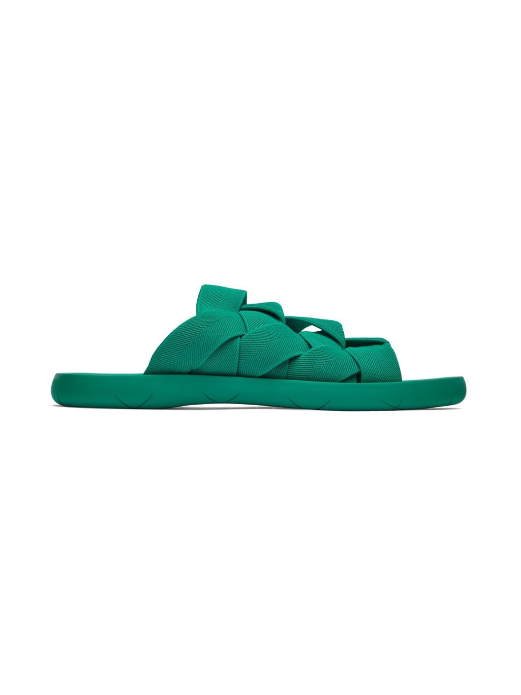 Intrecciato-woven elasticized webbing slip-on sandals in green. · Open square toe · Logo-embossed molded rubber footbed · Treaded rubber sole Supplier color: Acid turquoise Upper: textile. Sole: rubber. Made in Italy 221798M234588