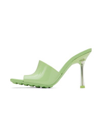 Rubber slip-on heeled sandals in green. · Open square toe · Logo-embossed leather footbed · Transparent covered stiletto heel · Treaded rubber sole · Heel: H3.5 in Supplier color: Pistachio Upper: rubber. Sole: leather, rubber. Made in Italy 222798F125018