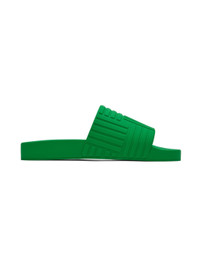 Rubber slip-on flat sandals in green. Graphic pattern embossed throughout. · Strap at vamp · Molded footbed · Treaded rubber outsole Supplier color: Parakeet Rubber. Made in Italy 221798F124021