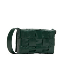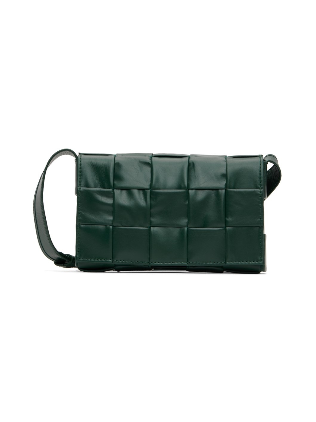 Intreccio-woven grained calfskin messenger bag in green. · Graphic hardware at adjustable pin-buckle shoulder strap · Foldover flap with magnetic closure · Zip pocket at interior · Unlined · Logo-engraved silver-tone hardware · H4 x W6.5 x D1.25 in Supplier color: Raintree/Silver Calfskin. Made in Italy 231798M170023
