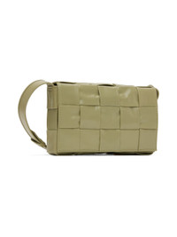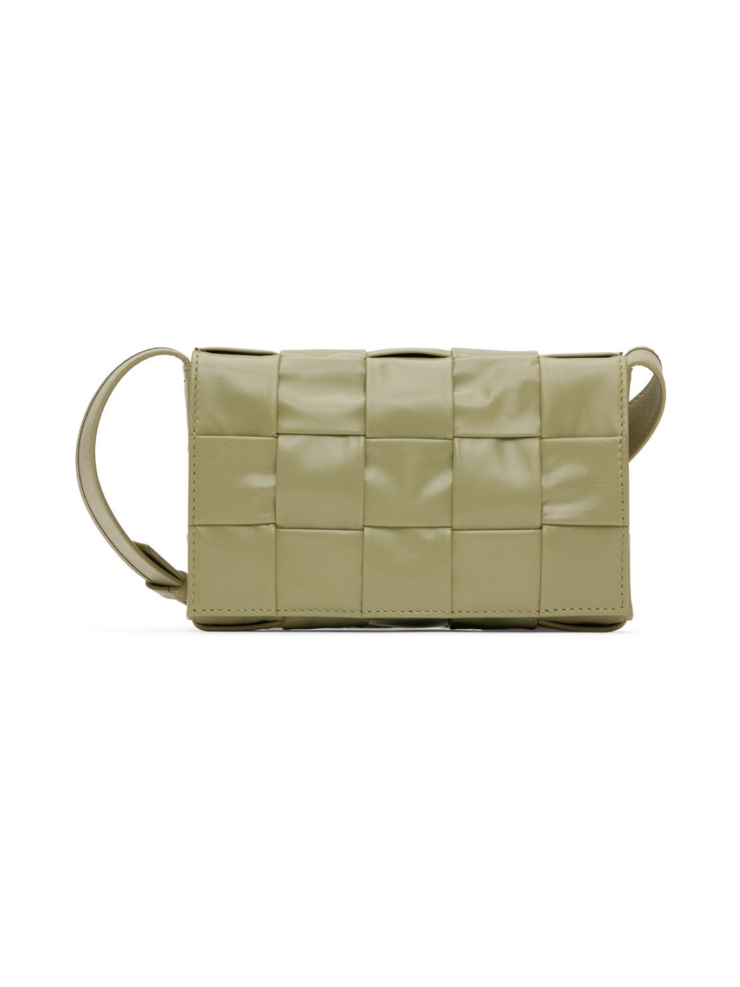 Intreccio-woven buffed calfskin messenger bag in green. · Logo hardware at adjustable shoulder strap · Foldover flap with magnetic closure · Zip pocket at interior · Leather lining · H4.75 x W7 x D2 in Supplier color: Travertine/Silver Calfskin, textile. Made in Italy 231798M170085