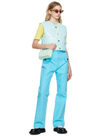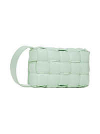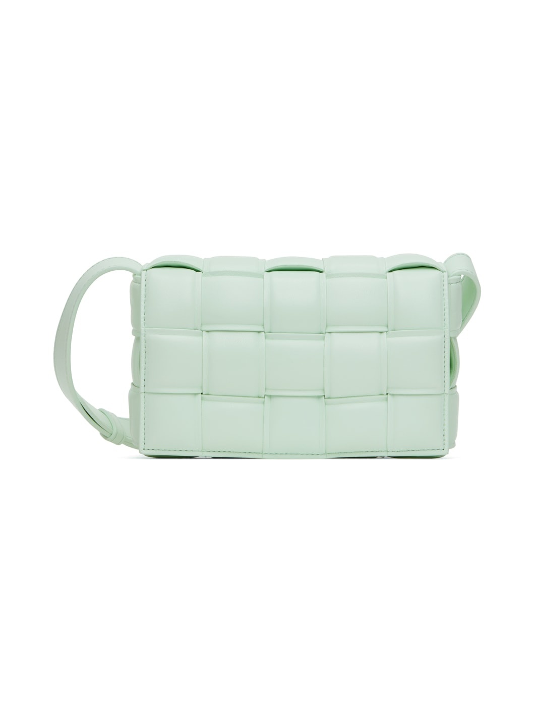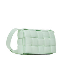Padded intreccio-woven grained lambskin shoulder bag in green. · Logo hardware at adjustable shoulder strap · Foldover flap with concealed tab-slot closure · Zip pocket at interior · Bonded lambskin lining · Logo-engraved gold-tone hardware · H4.75 x W7.5 x D2 in Supplier color: Glacier/Gold Lambskin. Made in Italy 231798F048084