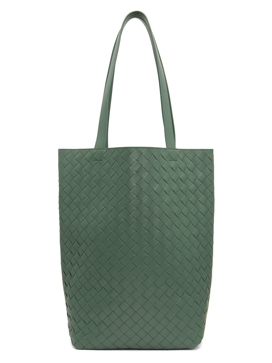Intrecciato-woven buffed calfskin tote in green. · Twin shoulder straps · Zip pouch at interior · Suede lining · Silver-tone hardware · H15.5" x W9.5" x D6" Supplier color: Aloe/Silver Calfskin. Made in Italy 241798F049003