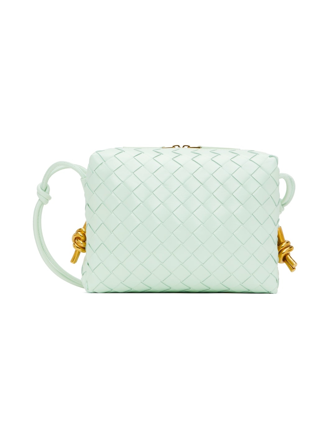 Intrecciato-woven calfskin shoulder bag in green. Knotted detailing and sculptural gold-tone hardware at adjustable shoulder strap. · Two-way zip closure · Calfskin lining · H6.5 x W8.5 x D3.5 in Supplier color: Glacier muse Calfskin. Made in Italy 231798F048091