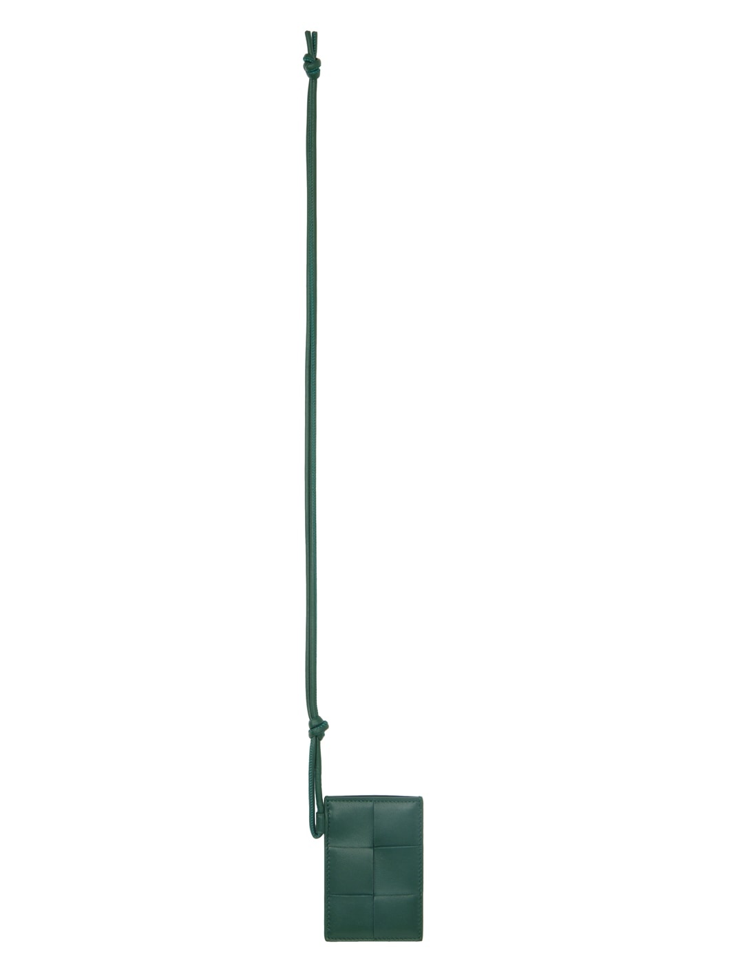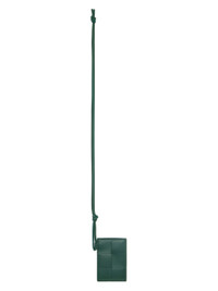 Intreccio-woven grained calfskin card holder in green. Burnished edges throughout. · Braided calfskin lanyard-style strap · One card slot · H4 x W2.75 in Supplier color: Raintree/Gold Calfskin. Made in Italy 231798F040011