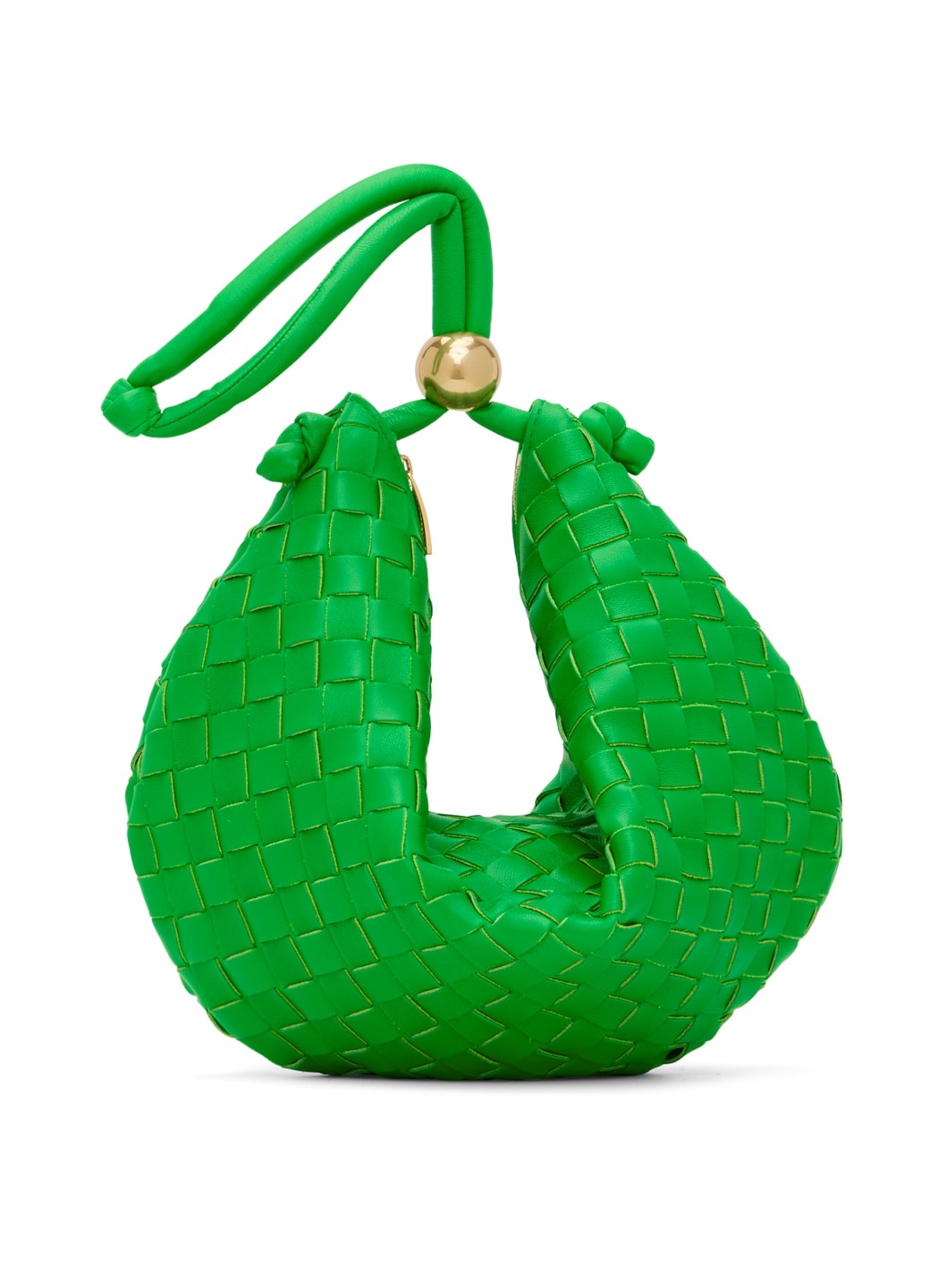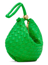 Intreccio-woven grained lambskin pouch in green. · Adjustable rolled drawstring carry handle · Zip closure · Logo embossed grained leather tag at interior · Bonded suede lining · Gold-tone hardware · H9.25 x W15 in Supplier color: Parakeet/Gold Lambskin. Made in Italy 221798F045005