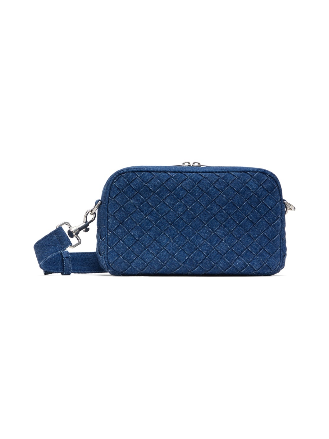 Intreccio-woven denim shoulder bag in indigo. · Detachable and adjustable shoulder strap · Two-way zip closure · Zip pocket and patch pocket at interior · Denim lining · Silver-tone hardware · H6 x W10 x D3 in Supplier color: Indigo/Silver Textile. Made in Italy 232798F048008