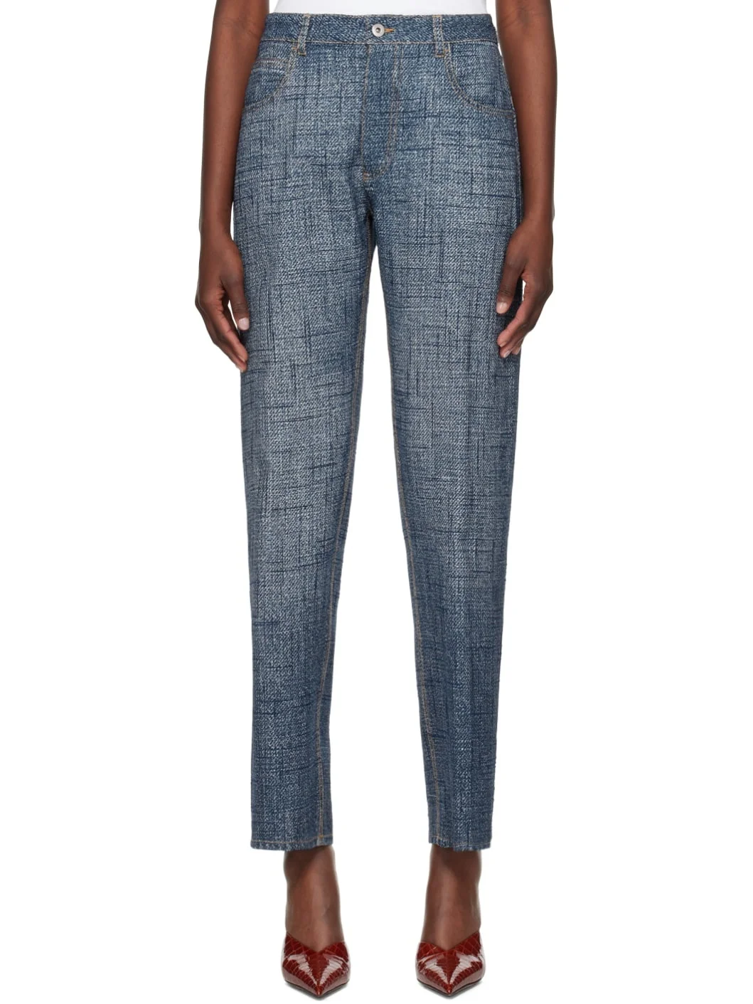 Straight-leg plain-woven viscose- and silk-blend trousers. Trompe l'œil graphic printed throughout. · Belt loops · Five-pocket styling · Button-fly · Logo patch at back waistband · Contrast stitching in tan Supplier color: Indigo/White 40% viscose, 35% silk, 25% polyester. Made in Italy 241798F087002