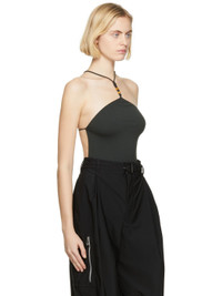 Sleeveless stretch cashmere-blend bodysuit in khaki. Beaded detailing at halter strap. Criss-crossing straps at open back. Press-stud closure at bottom. Unlined. Silver-tone and multicolor hardware. Supplier color: Camping 80% cashmere, 10% polyamide, 7% polyester, 3% elastane. Made in Italy 211798F358002