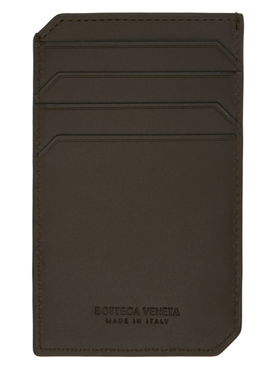 Intrecciato-woven buffed calfskin card holder in khaki. · Logo stamp at back face · Four card slots · One note slot · H4.75" x W3" Supplier color: Kaki Calfskin. Made in Italy 242798M163001