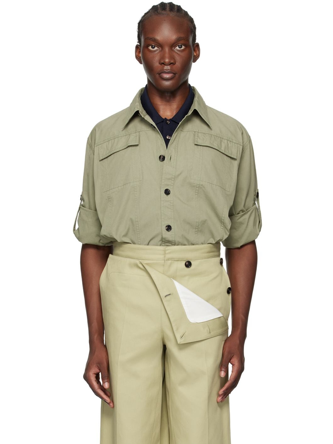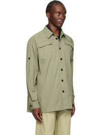 Lightweight cotton twill shirt. · Spread collar · Button closure · Flap pockets at chest · Vented side seams · Button applique at sleeves · Pleat at single-button barrel cuffs · Horn hardware Supplier color: Juniper 100% cotton. Made in Italy 242798M192002