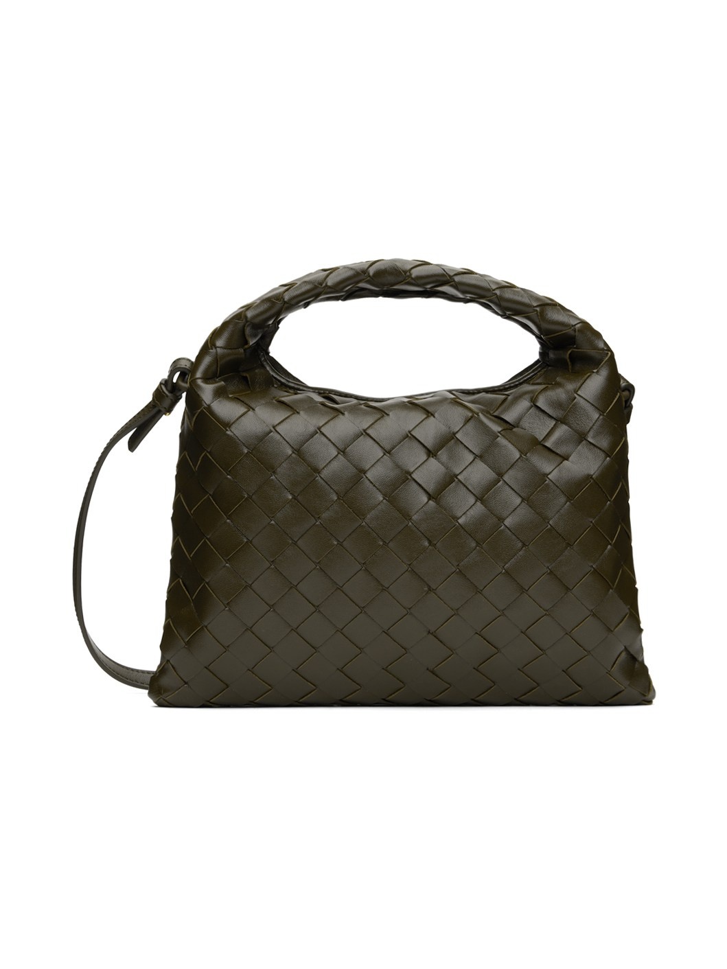 Intrecciato-woven grained calfskin shoulder bag in khaki. · Integrated carry handle · Adjustable and detachable crossbody strap · Magnetic closure · Buffed calfskin lining · Brass-tone hardware · H7" x W10" x D2.5" · Total height: H9" Supplier color: Kaki/Brass Calfskin. Made in Italy 242798F048032