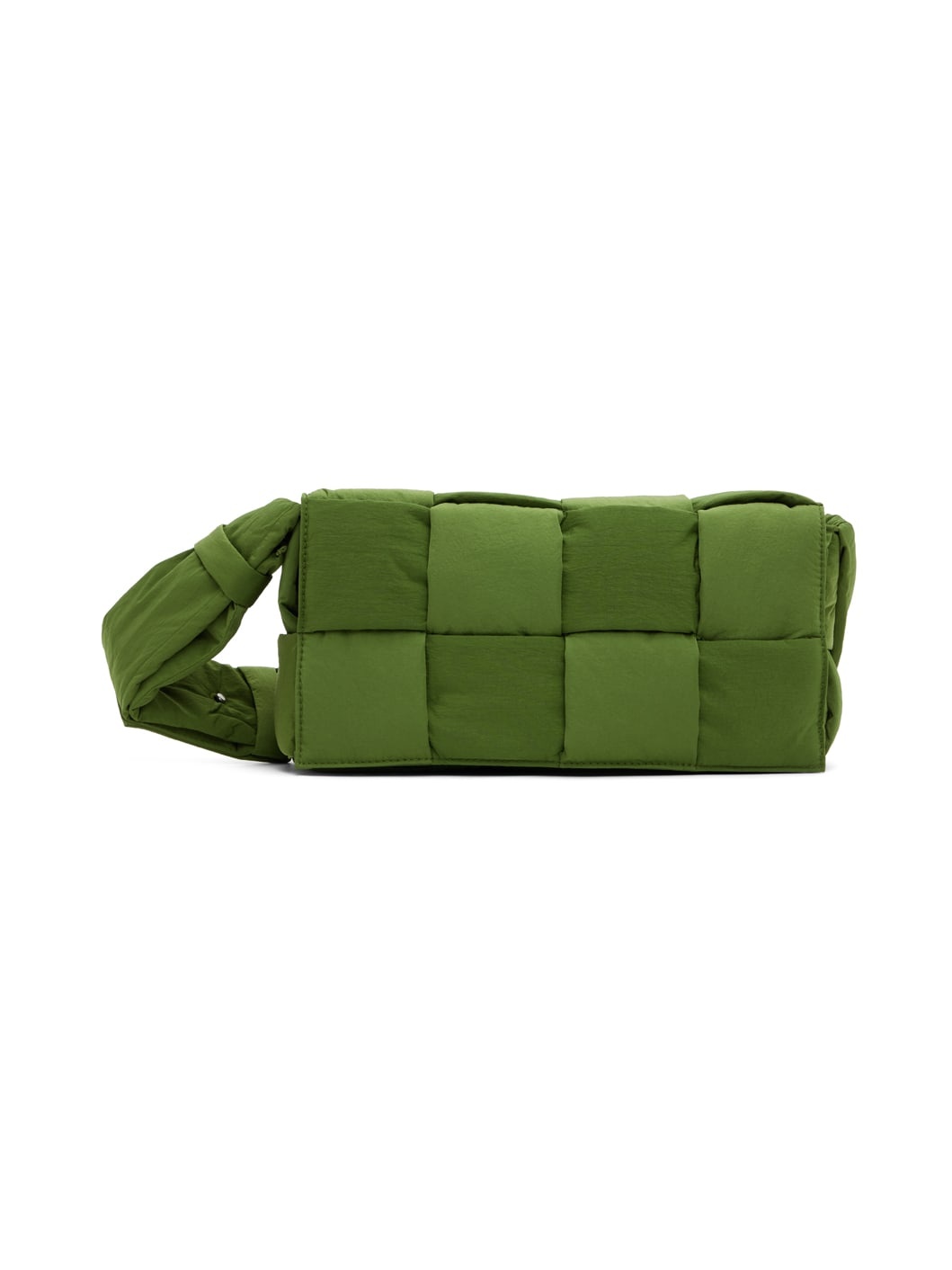 Padded intrecciato-woven nylon taffeta messenger bag in khaki. · Adjustable shoulder strap · Foldover flap with magnetic fastening · Detachable zip pouch at interior · Unlined · H13 x W6 x D3 in Supplier color: Avocado/Silver Textile. Made in Italy 231798F048071