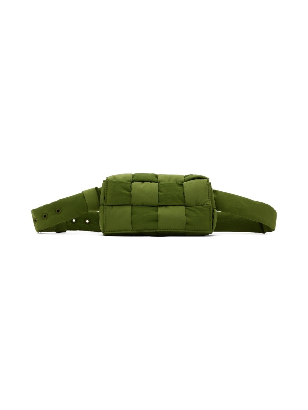 Padded intreccio-woven nylon crepe messenger bag in khaki. · Adjustable shoulder strap · Foldover flap · Card slot at interior · Crepe lining · Silver-tone hardware · H3 x W5 x D2 in Supplier color: Avocado Textile. Made in Italy 231798M170069