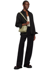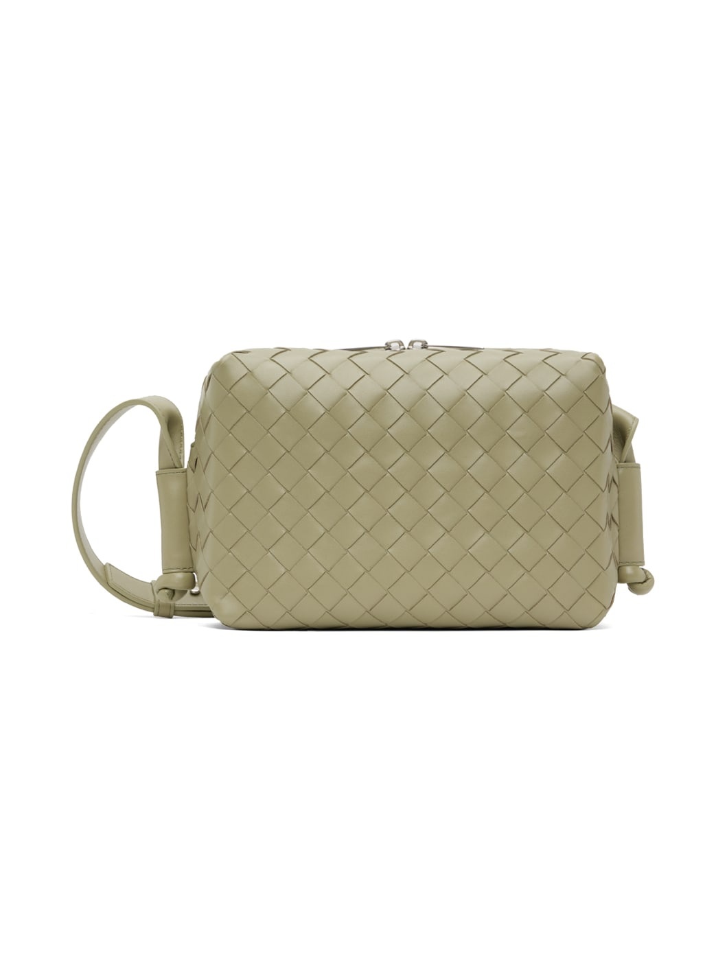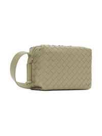 Intrecciato-woven buffed calfskin messenger bag in khaki. · Adjustable shoulder strap · Two-way zip closure · Zip pocket and patch pocket at interior · Canvas lining · H6 x W9 x D4 in Supplier color: Travertine/Silver Calfskin. Made in Italy 232798M170021