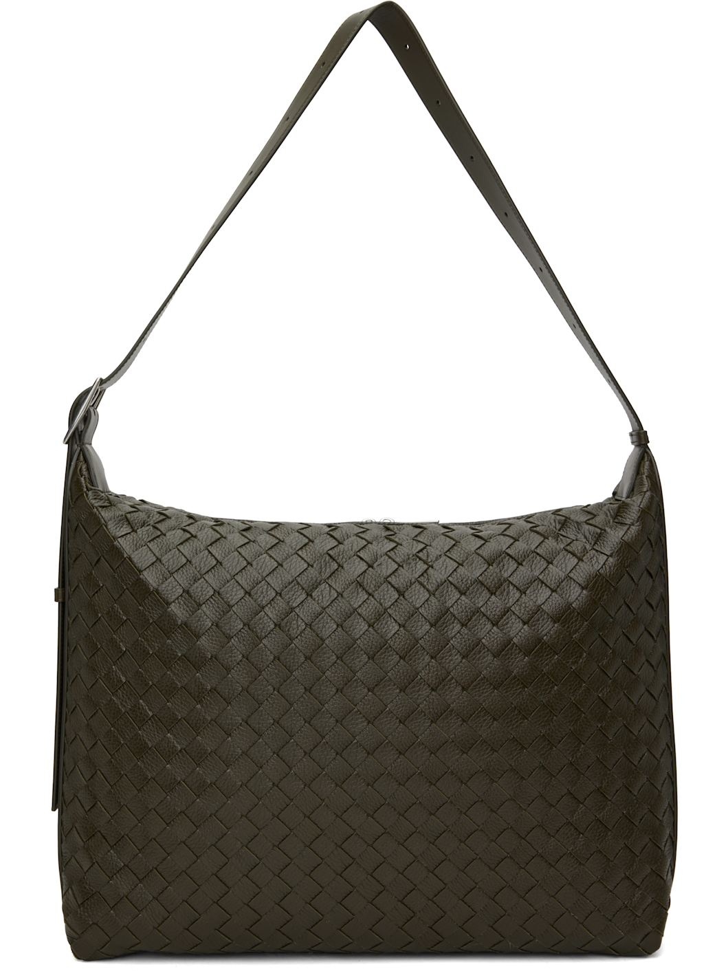 Intrecciato-woven grained deerskin messenger bag in khaki. · Buffed deerskin trim throughout · Adjustable crossbody strap · Zip closure · Keyring at interior · Zip pocket and patch pockets · Suede lining · Logo-engraved silver-tone hardware · H14" x W16.5" x D4" Supplier color: Kaki/Silver Deerskin. Made in Italy 242798M170028