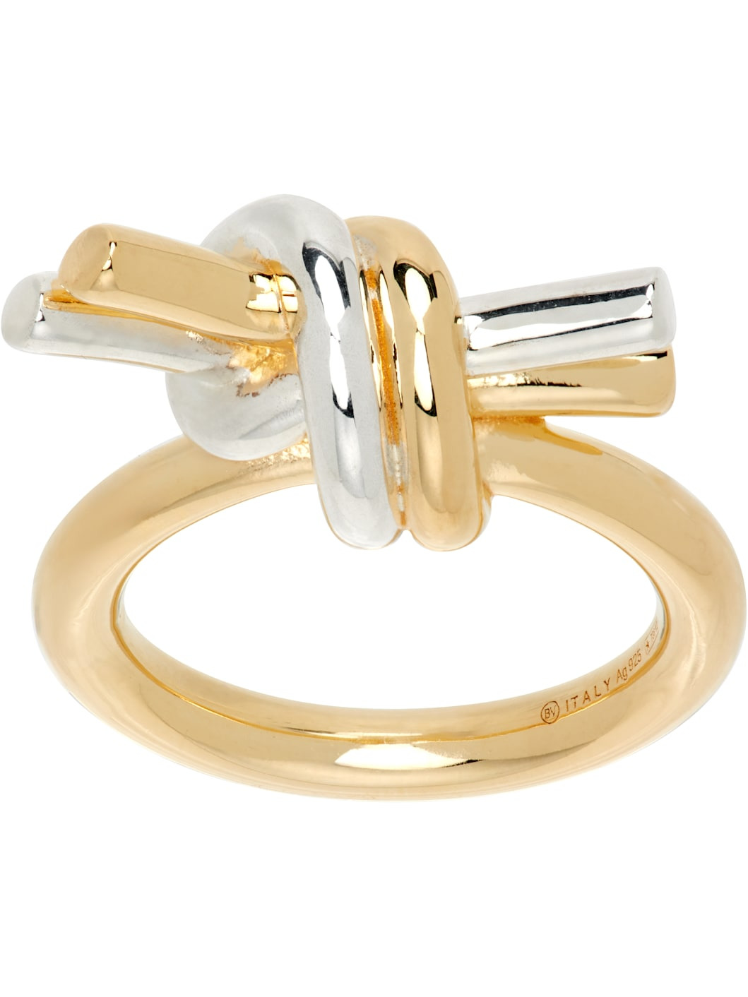 Tubular-band ring in 18k gold-plated sterling silver. · Sterling silver knot at face · Logo and hallmarking at inner band Supplier color: Silver/Yellow gold 18k gold-plated 925 sterling silver, 925 sterling silver. Made in Italy 252798F024002