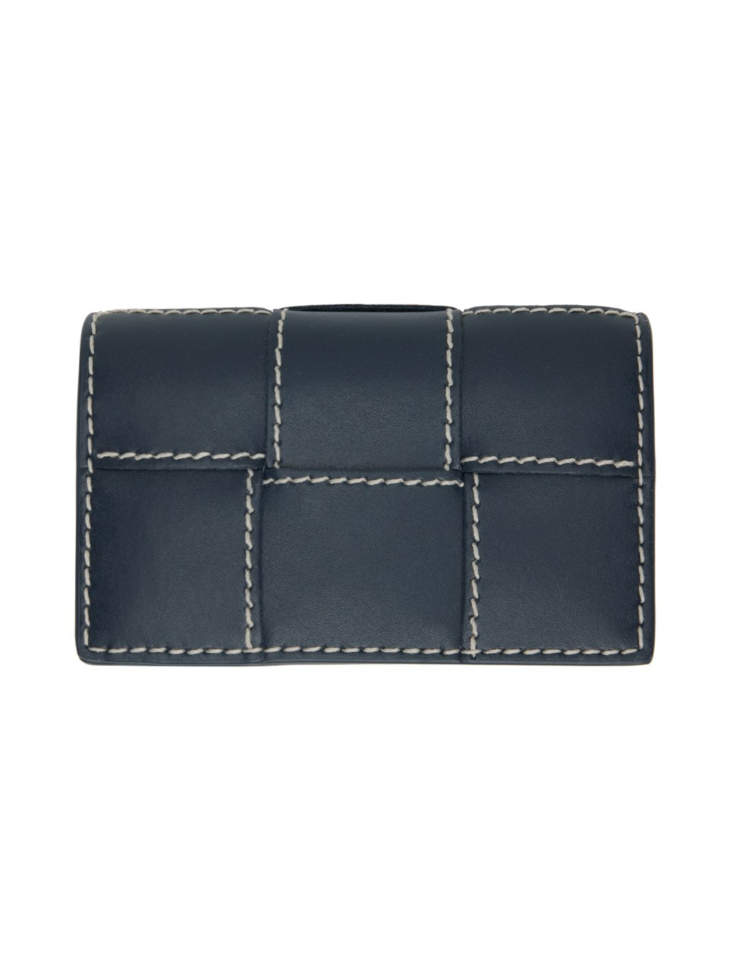 Intrecciato-woven grained calfskin card holder in navy. · Burnished edges throughout · Concealed patch pocket at face · Press-stud flap · Buffed calfskin lining · Contrast stitching in white · H3" x W4.75" x D1.25" Supplier color: Blue Calfskin. Made in Italy 242798M164013