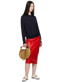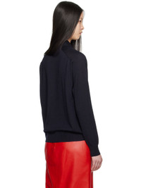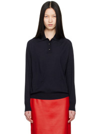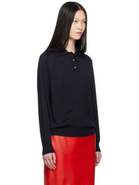 Knit wool polo. Exposed seams throughout. · Rib knit spread collar, hem, and cuffs · Three-button placket · Logo embroidered at front · Saddle shoulders Supplier color: Navy 100% wool. Made in Italy 242798F108002