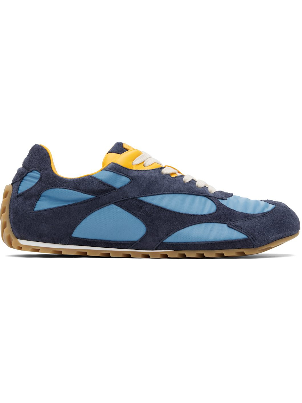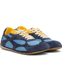 Low-top suede and nylon taffeta sneakers. · Lace-up closure · Logo patch at padded tongue · Padded collar · Logo embossed at heel tab · Buffed lambskin lining · Treaded rubber sole Supplier color: Abyss/Ice/Egg yolk Upper: leather, textile. Sole: rubber. Made in Italy 252798M237001