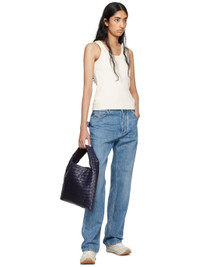 Intrecciato-woven grained calfskin shoulder bag in navy. · Fixed shoulder strap · Open throat · Zip pocket at interior · Grained calfskin lining · H11.5 x W17" x D1.5" · Total height: H14.5" Supplier color: Duke-m brass Calfskin. Made in Italy 242798F046008