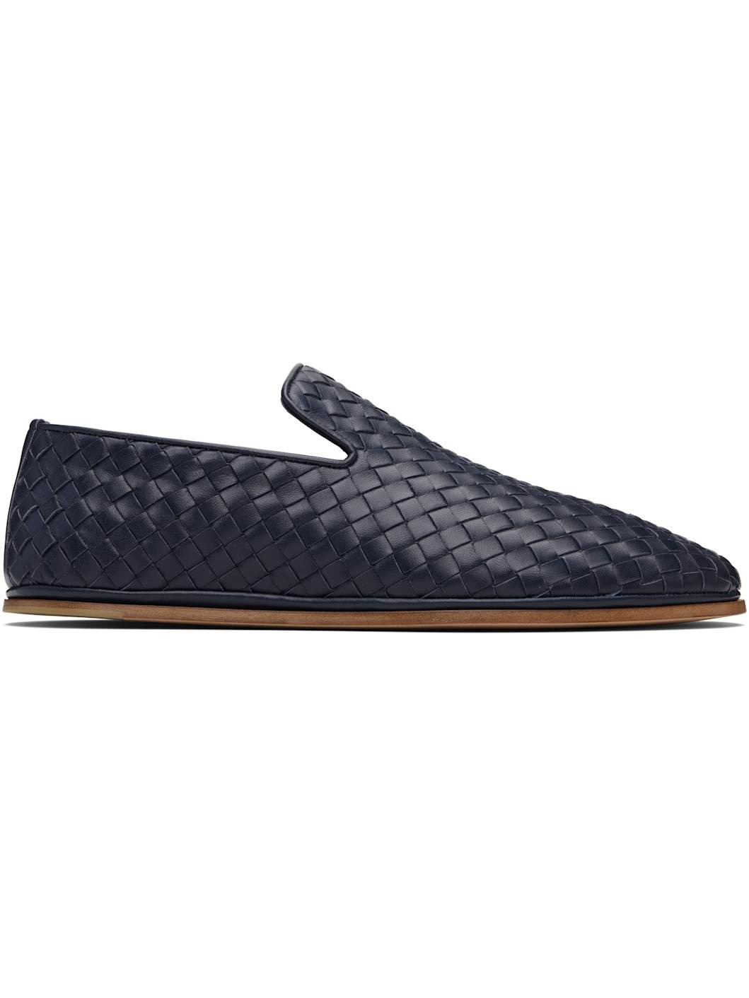 Intrecciato-woven buffed lambskin slippers. · Logo embossed at padded footbed · Leather sole with rubber injection Supplier color: Abyss Upper: lambskin. Sole: leather, rubber. Made in Italy 252798M231006