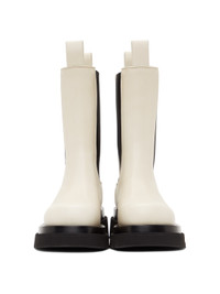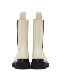 Calf-high vegetable-tanned calfskin boots in off-white. Round toe. Elasticized gusset in black at sides. Pull-loops at collar. Leather welt in black. Treaded rubber sole in black. Supplier color: Sea salt Upper: calfskin. Sole: rubber. Made in Italy 212798F114008