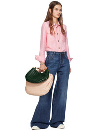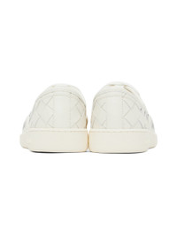Low-top intrecciato-woven buffed calfskin sneakers in off-white. · Lace-up closure · Logo flag at side · Buffed calfskin and suede lining · Logo embossed at textured rubber midsole · Treaded rubber sole Supplier color: White Upper: calfskin. Sole: rubber. Made in Italy 241798F128003