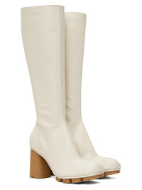 Knee-high buffed lambskin boots in off-white. · Square toe · Zip closure at inner side · Nappa lambskin and suede lining · Rubber block heel · Rubberized logo patch at sole · Covered lambskin sole with rubber injection · Heel: H3.5" Supplier color: Sea salt Upper: lambskin. Sole: lambskin, rubber. Made in Italy 242798F115001