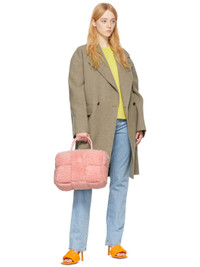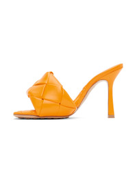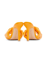 Intrecciato-woven buffed lambskin heeled sandals in orange. · Open square toe · Logo-embossed intrecciato-woven footbed · Covered stiletto heel · Leather outsole with rubber injections · Heel: H4 in Supplier color: Tangerine Upper: lambskin. Sole: leather, rubber. Made in Italy 221798F125004