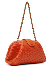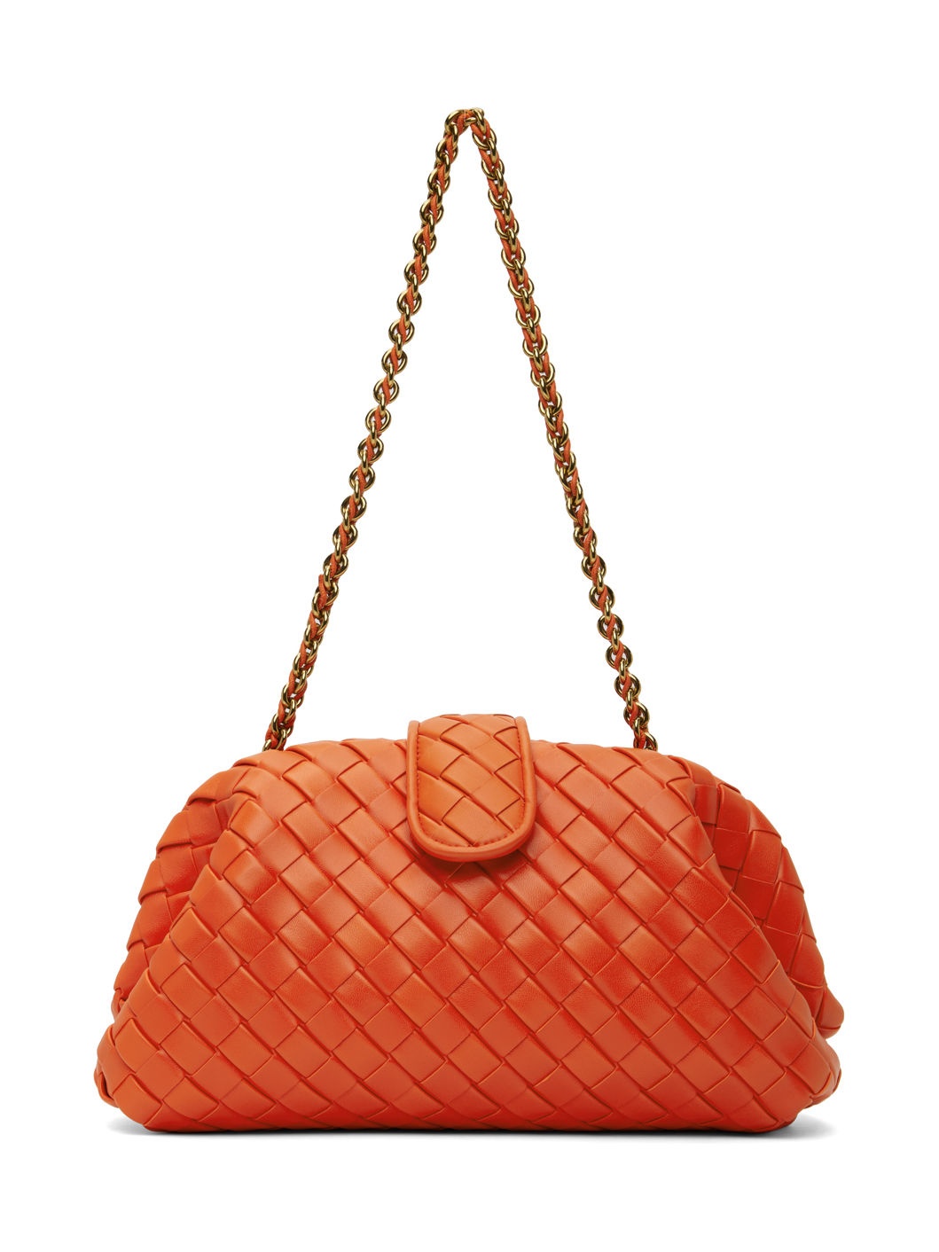 Intrecciato-woven buffed calfskin clutch in orange. · Cable chain shoulder strap · Magnetic press-stud tab at hinged closure · Buffed lambskin interior · H8" x W13" x D5" Supplier color: Orange/Brass Calfskin. Made in Italy 242798F044002